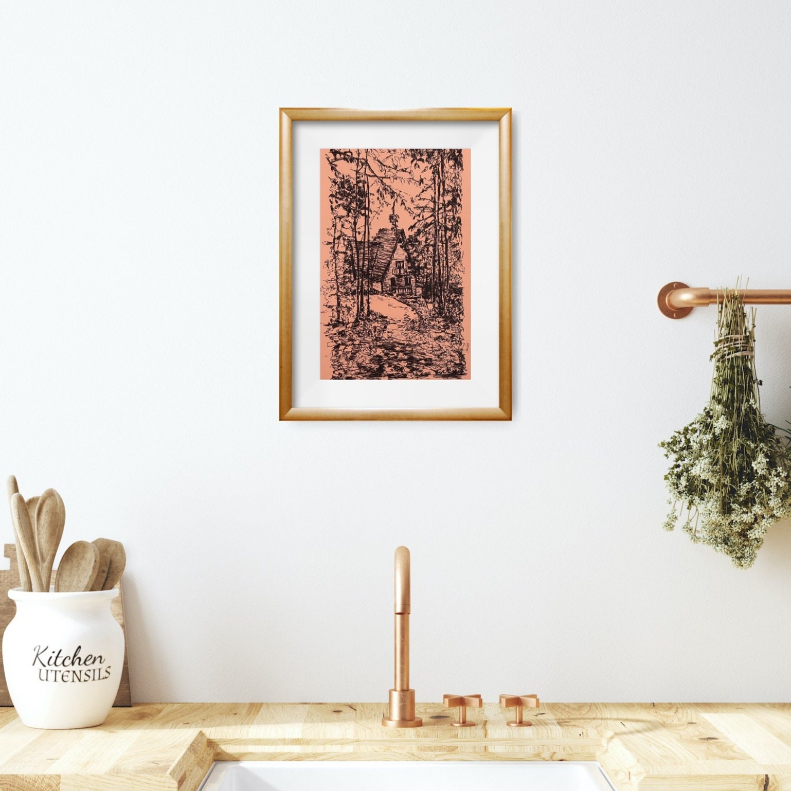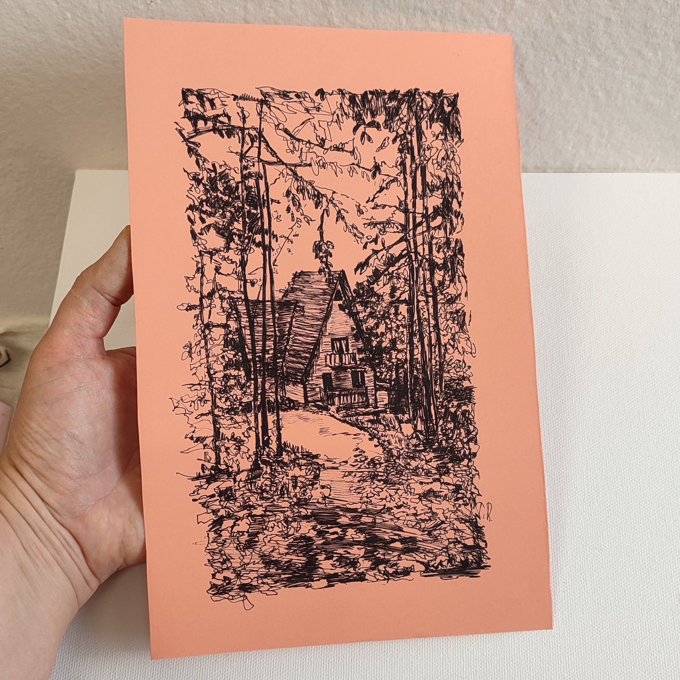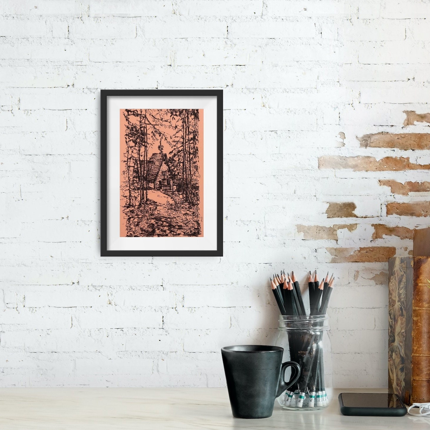 Path painting. Home decore original ink drawing. Wall decore ink drawing tree and old barn painting. Small presents for art lovers, gifts for your best friend, 25x16 cm. ArtduStudio.