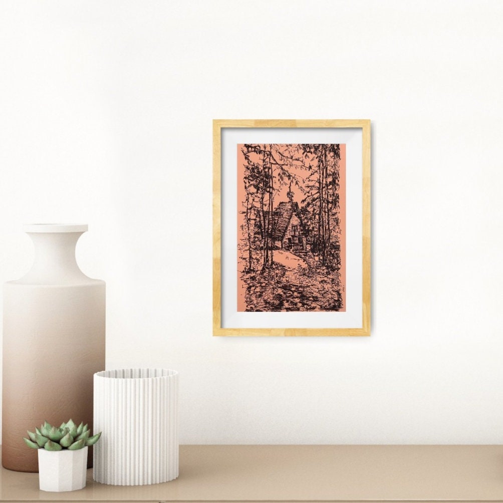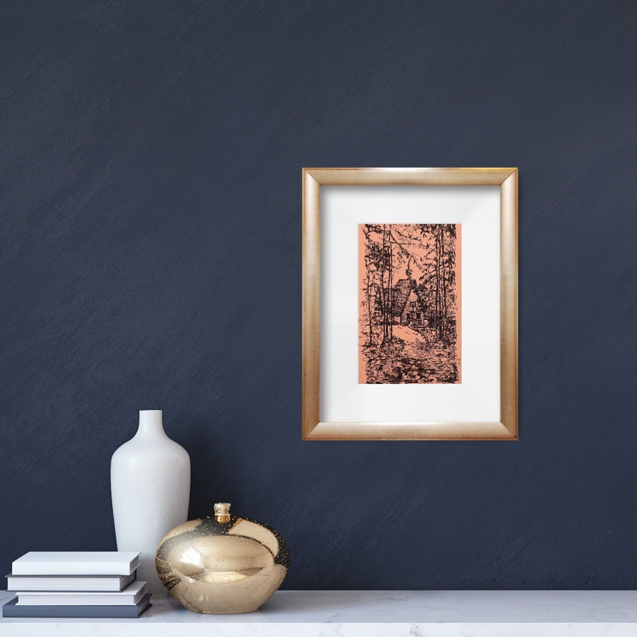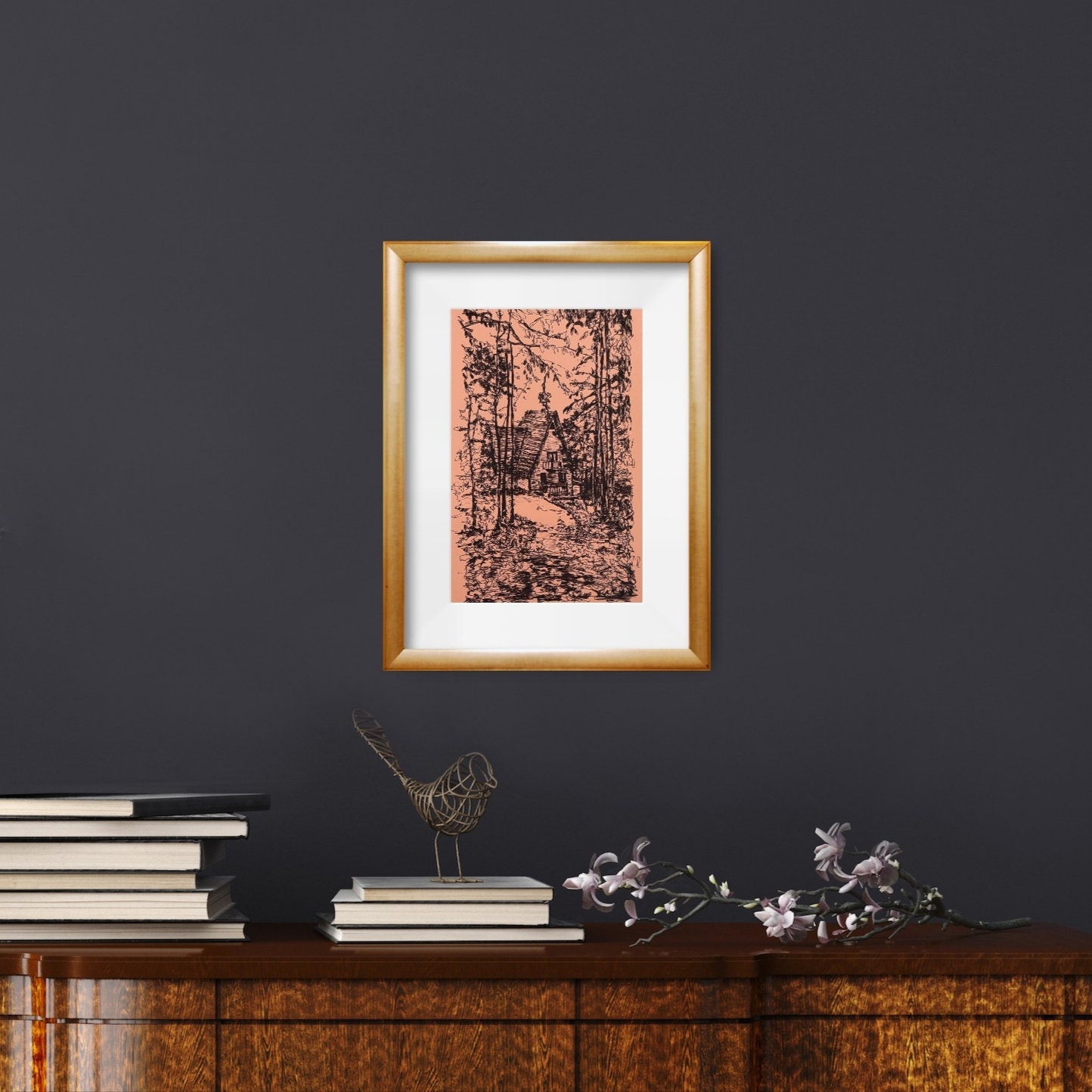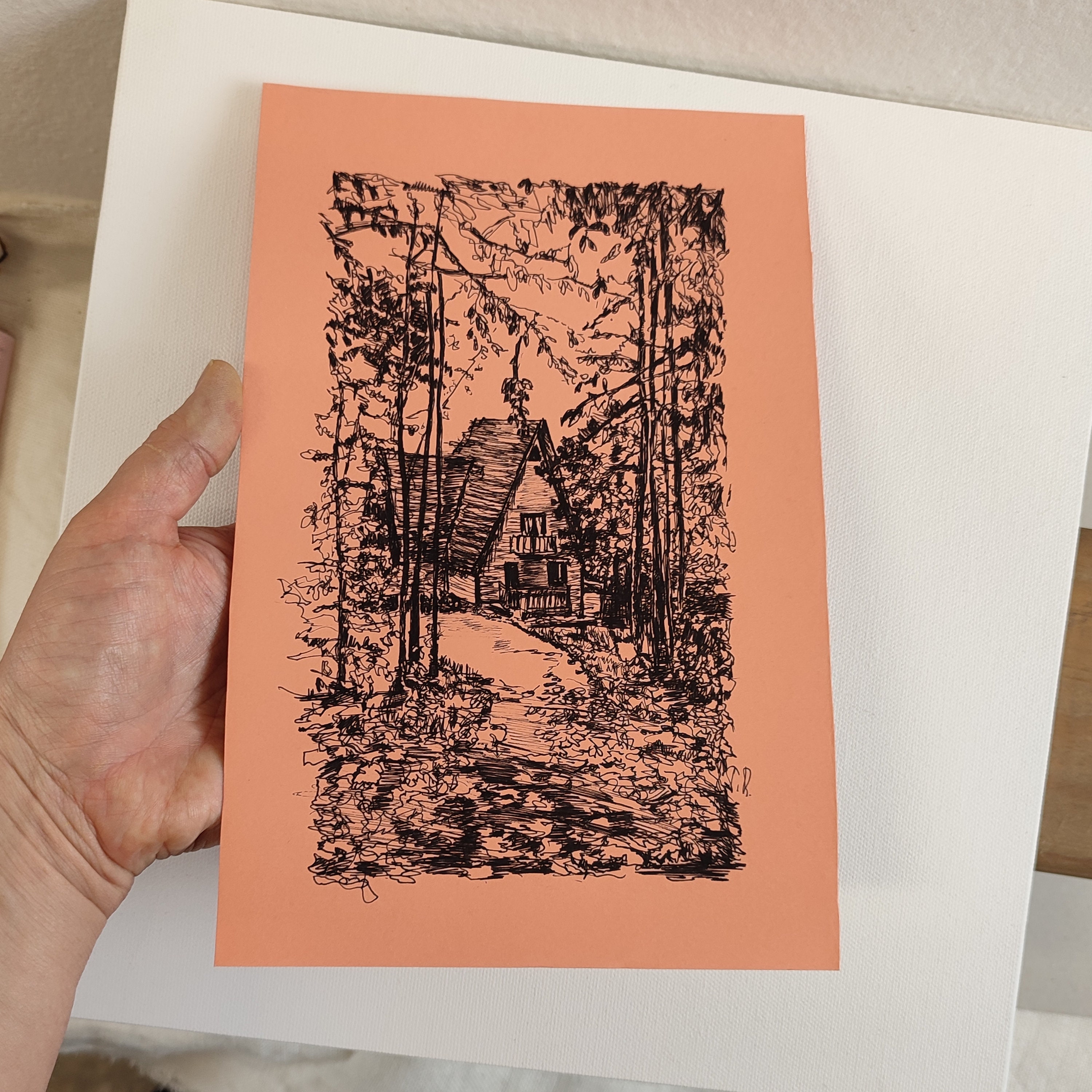 Path painting. Home decore original ink drawing. Wall decore ink drawing tree and old barn painting. Small presents for art lovers, gifts for your best friend, 25x16 cm. ArtduStudio.