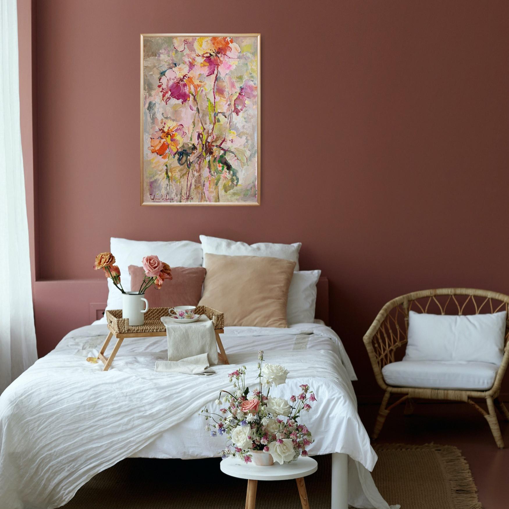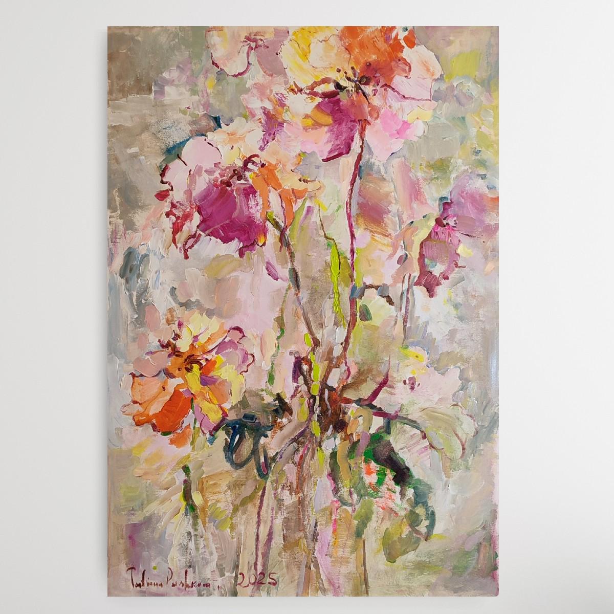 Pink orange and grey colors abstract floral painting. Warm pink, orange, yellow limon and soft grey tones.