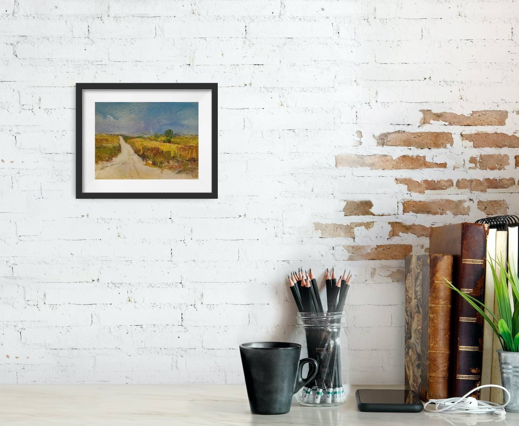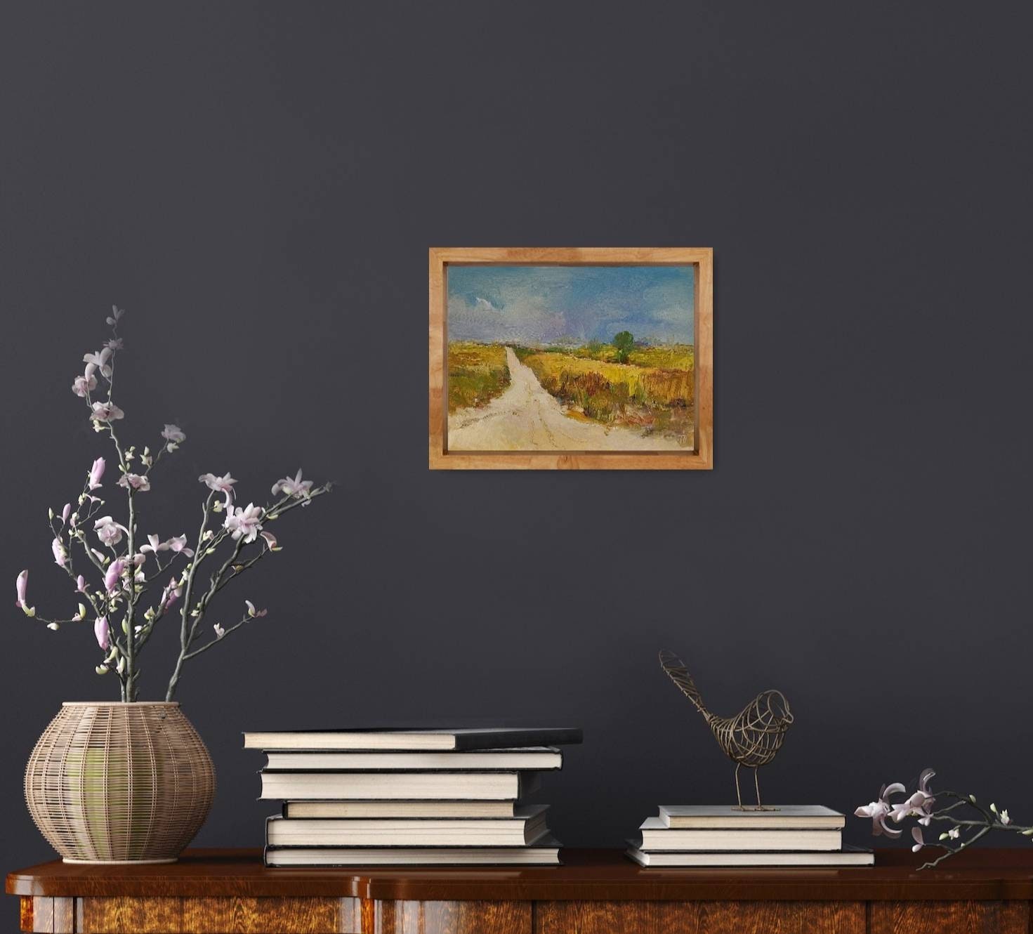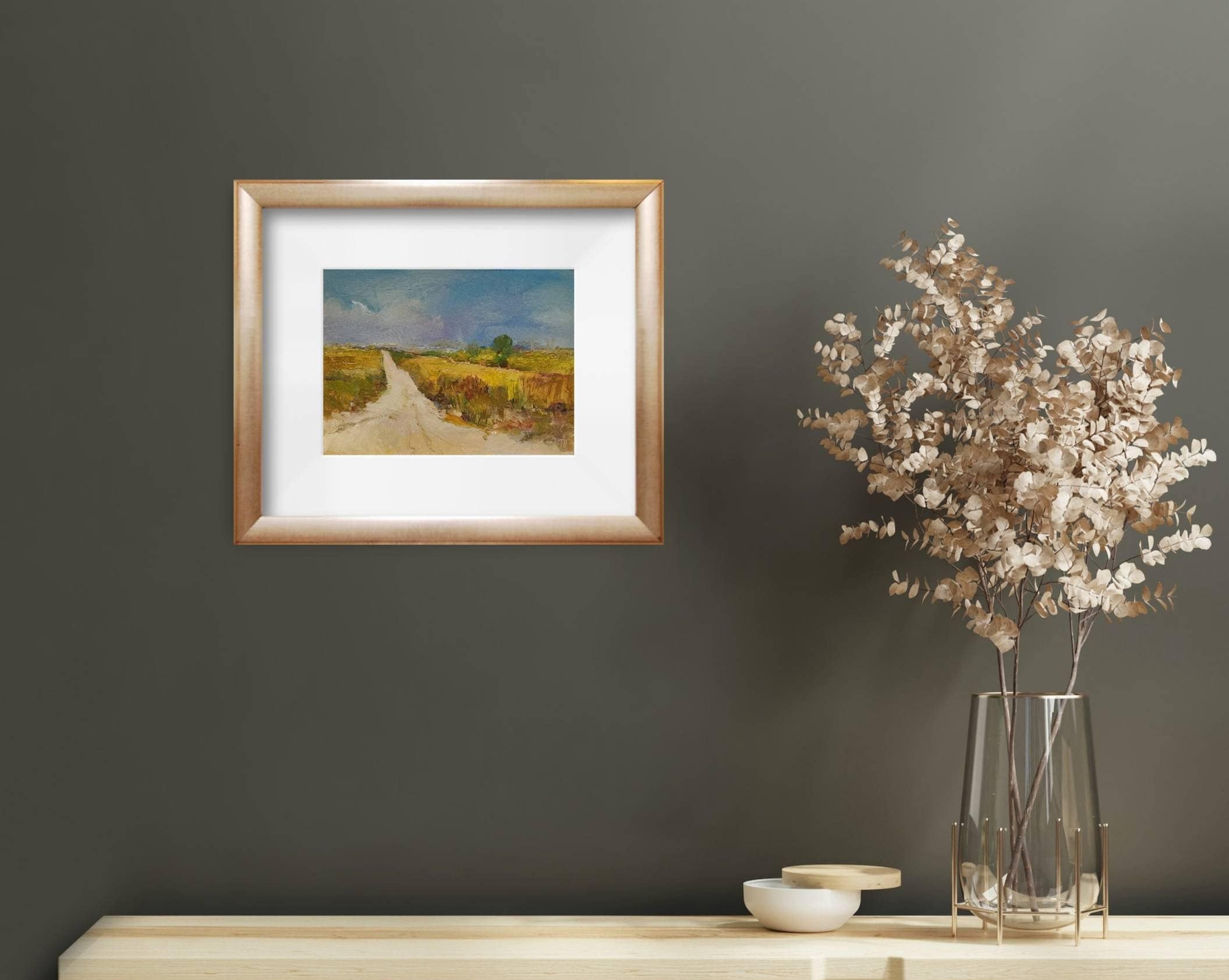 Painting of a steppe landscape at the end of summer. Made in natural shades of earth colors, dry grass, light and dark red ocher. The warm light road contrasts with the cool blue tones of the sky. Painting carries a calm positive mood.
