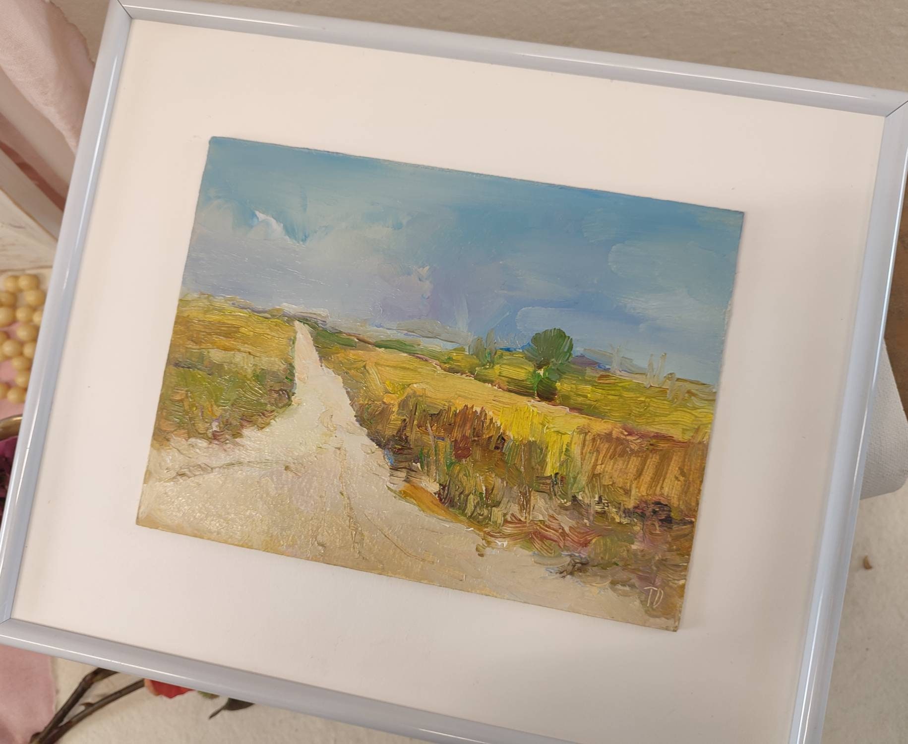This painting is very suitable for framing. It will be decorated with frames of white shades of "ivory", shades of bronze, copper tones. She is very suitable framing with passe-partout.
