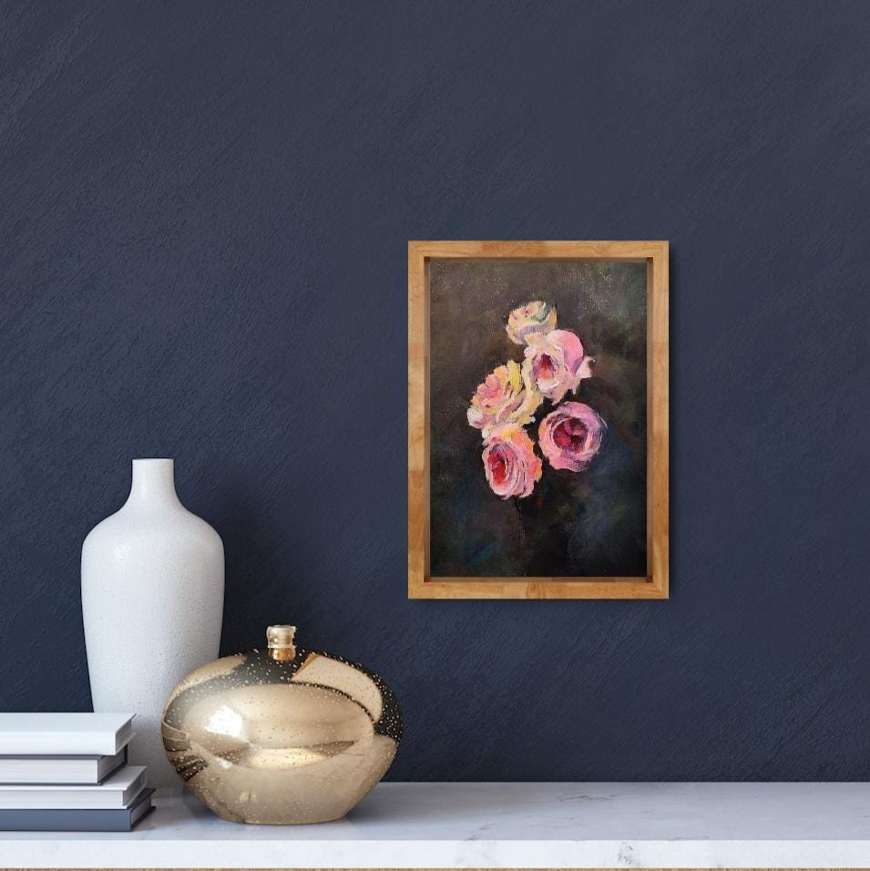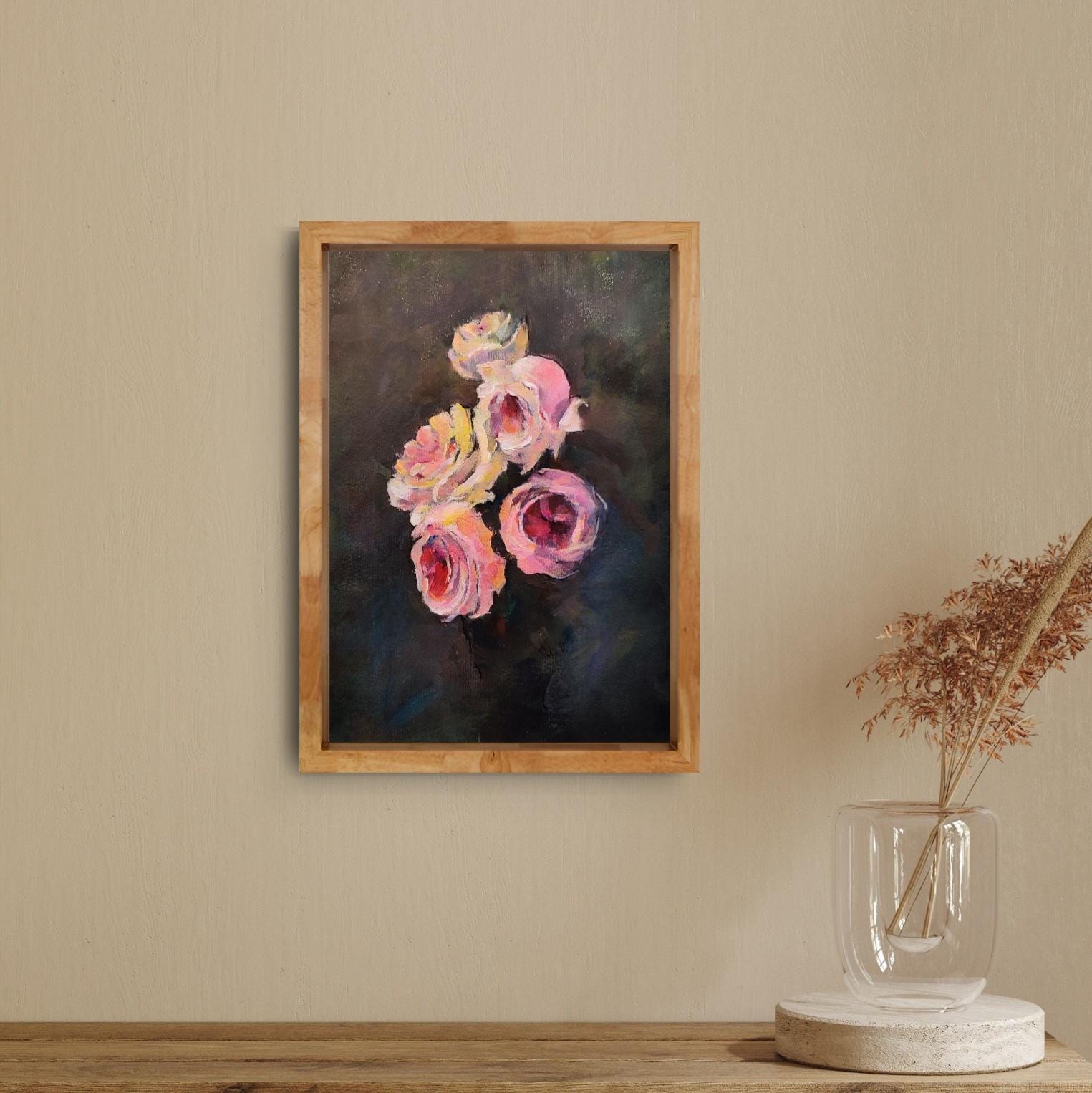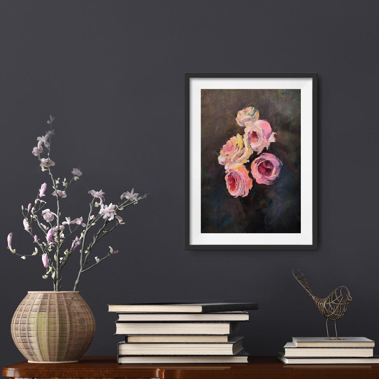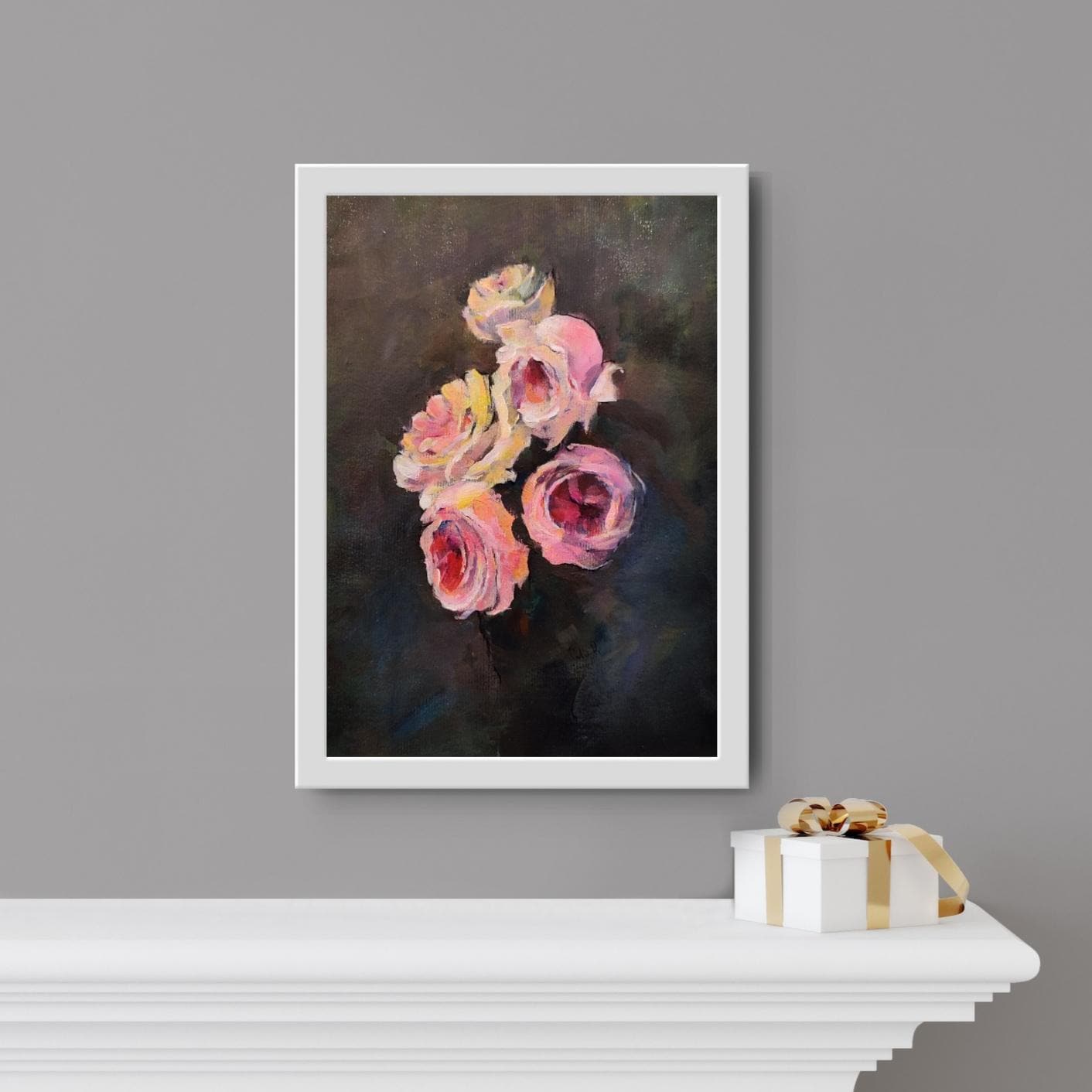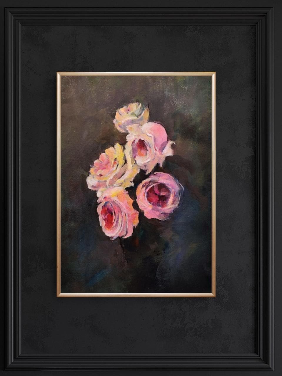 Original Rose acrylic painting. Pink Rose bouquet painting on black. Dark floral painting, a beautiful presentable gift for a collector, gifts for your best friend 8x12 inches, 20x28 cm.