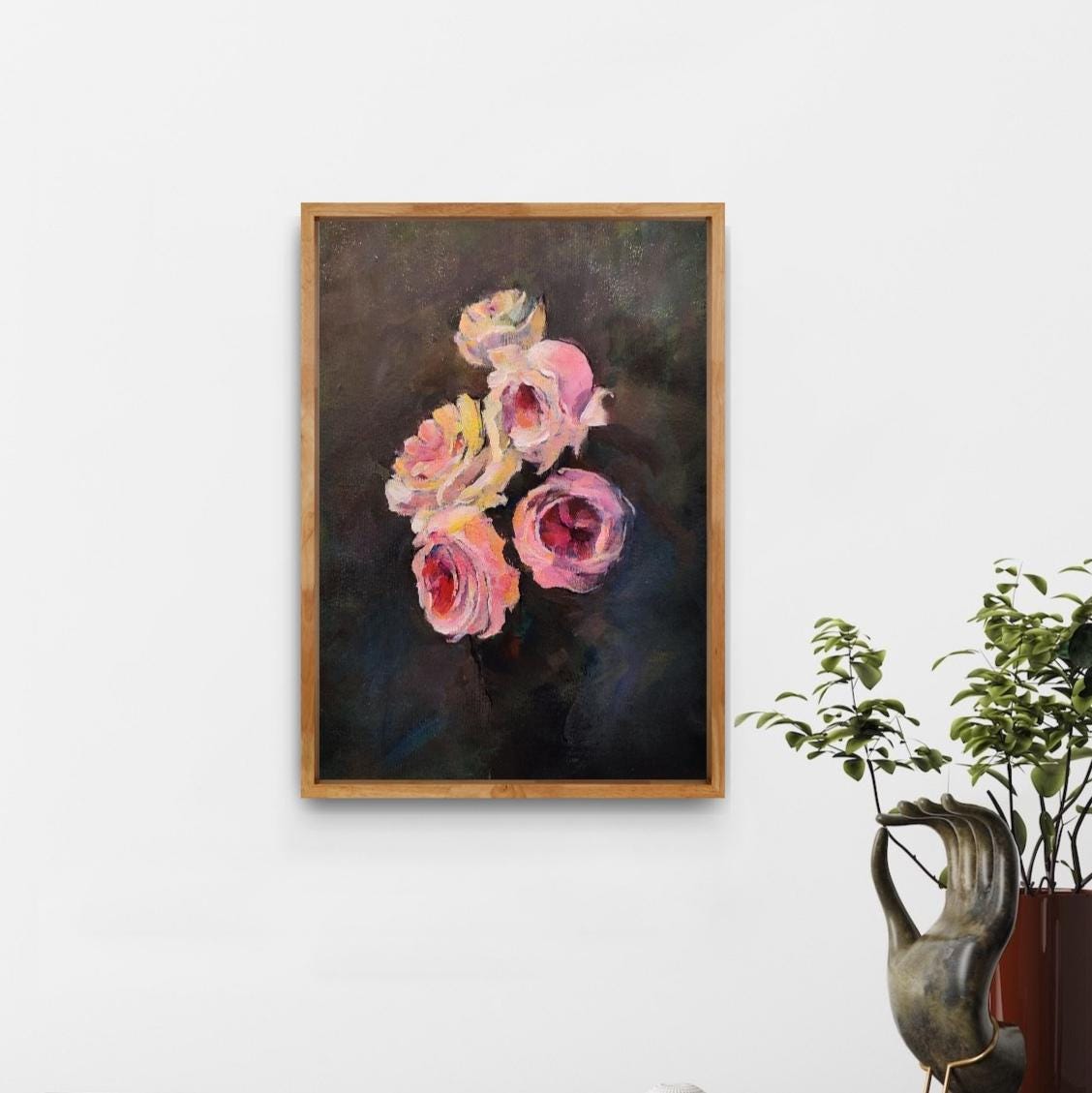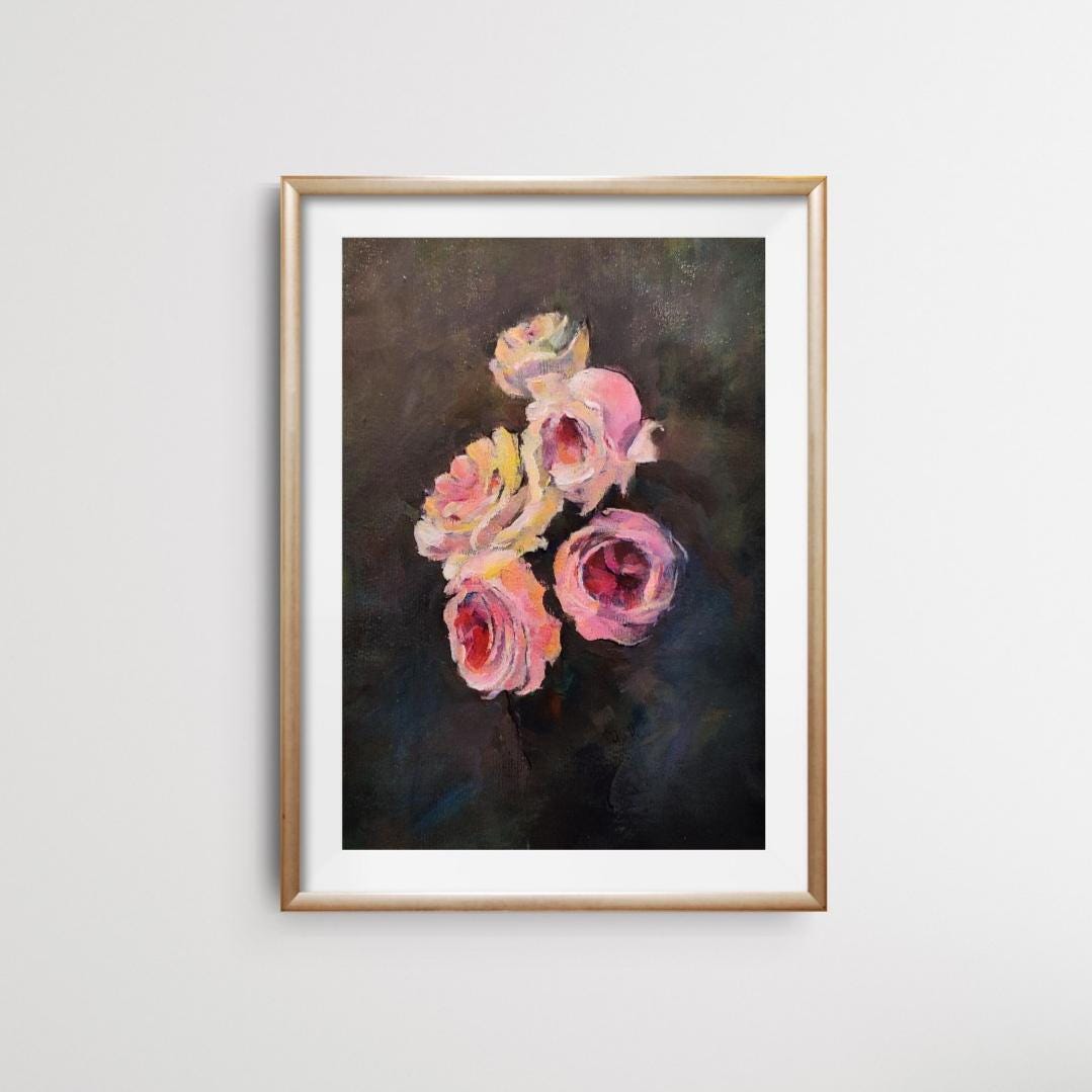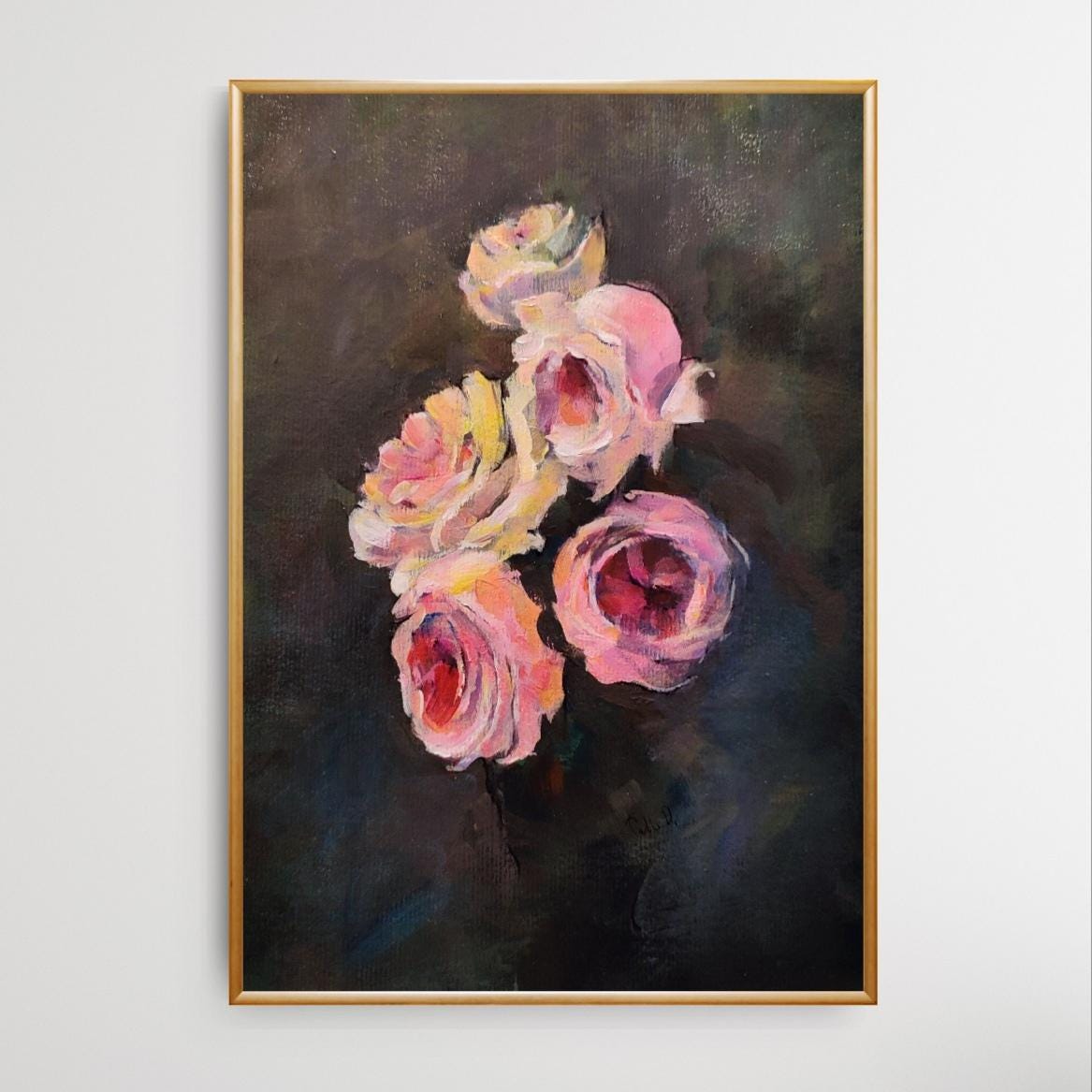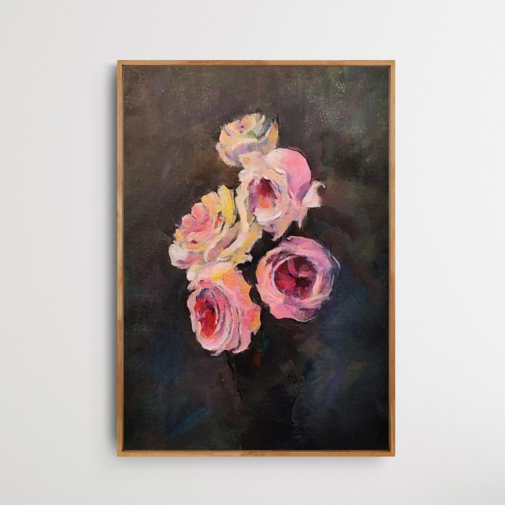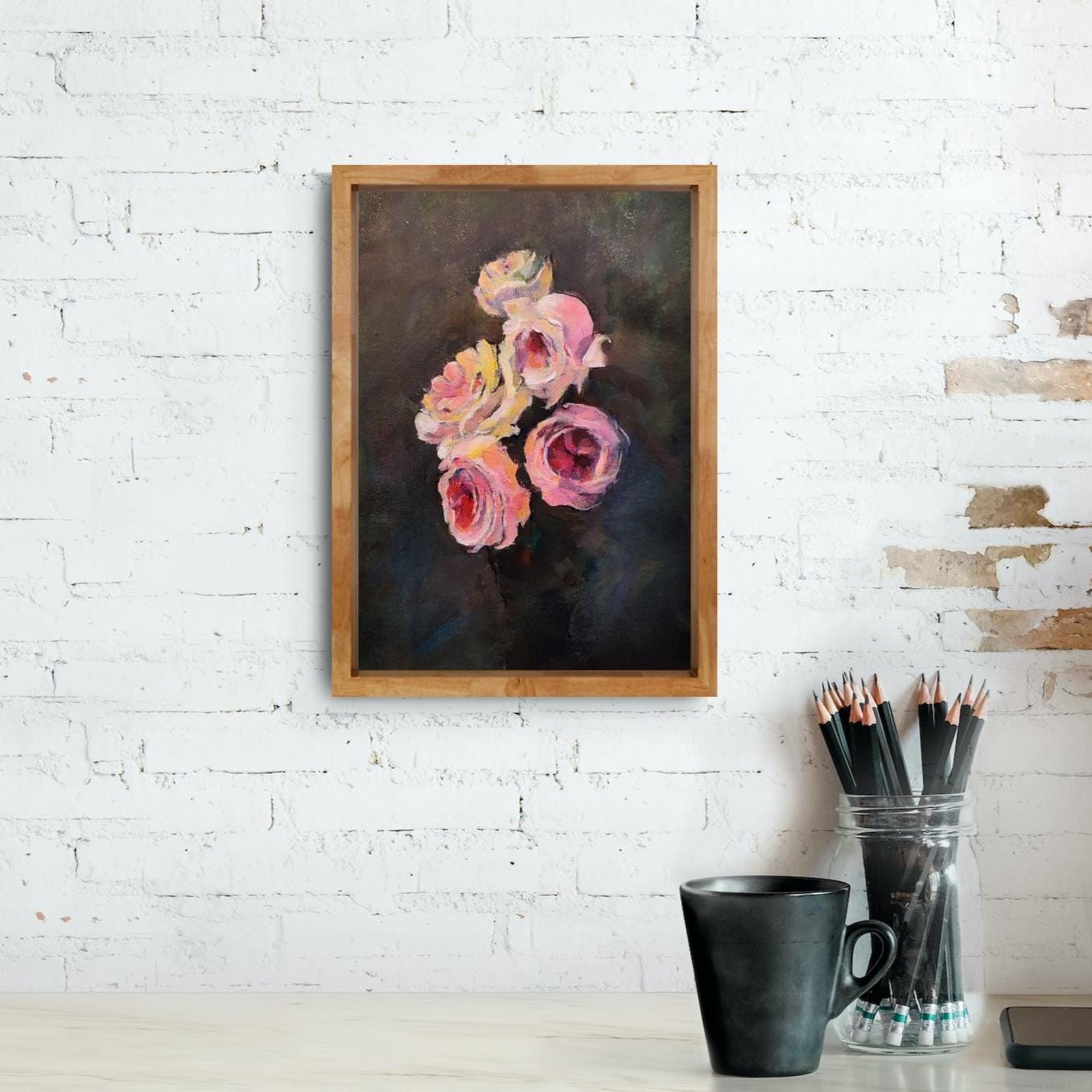 Original Rose acrylic painting. Pink Rose bouquet painting on black. Dark floral painting, a beautiful presentable gift for a collector, gifts for your best friend 8x12 inches, 20x28 cm.