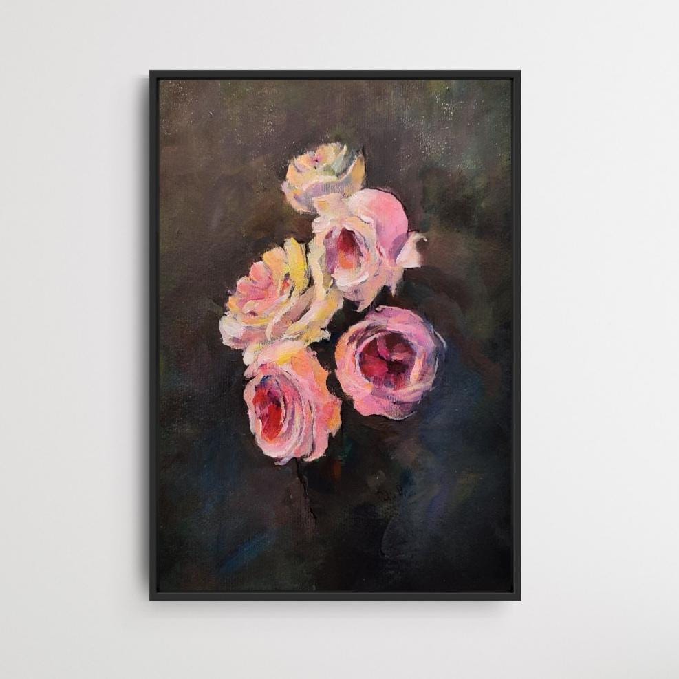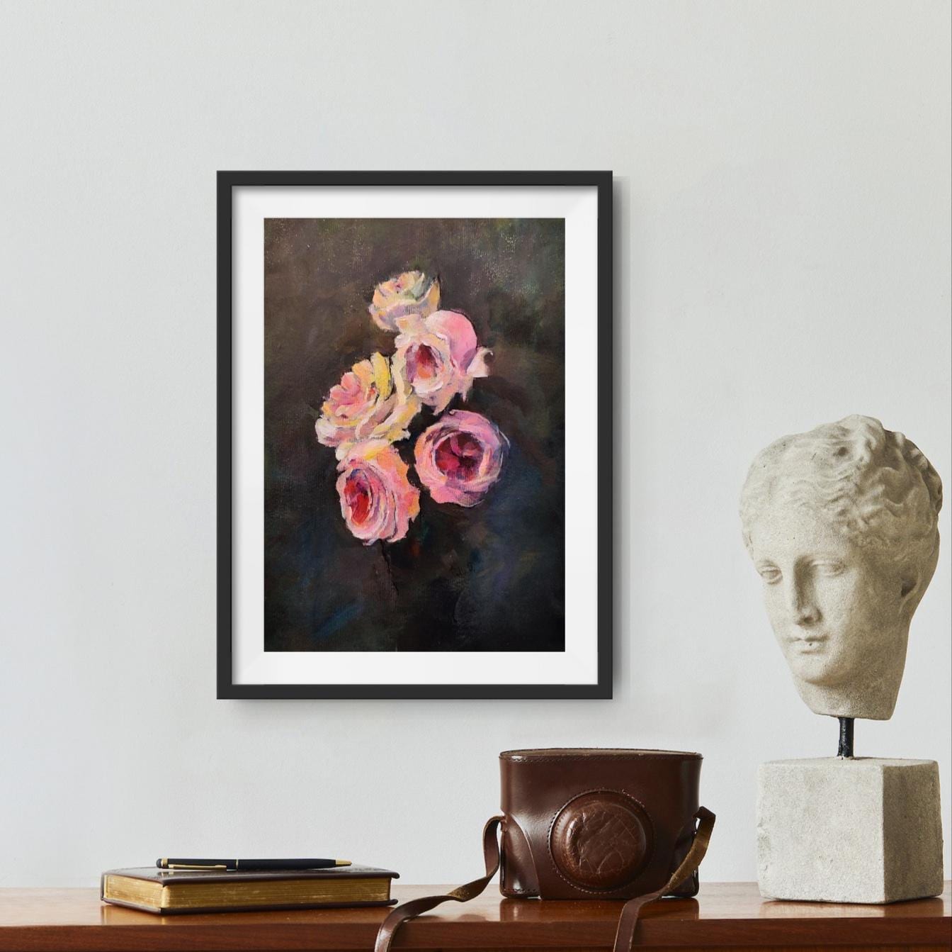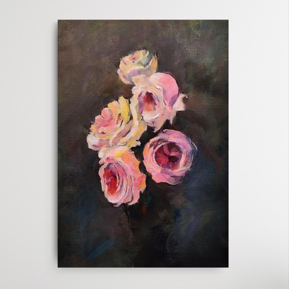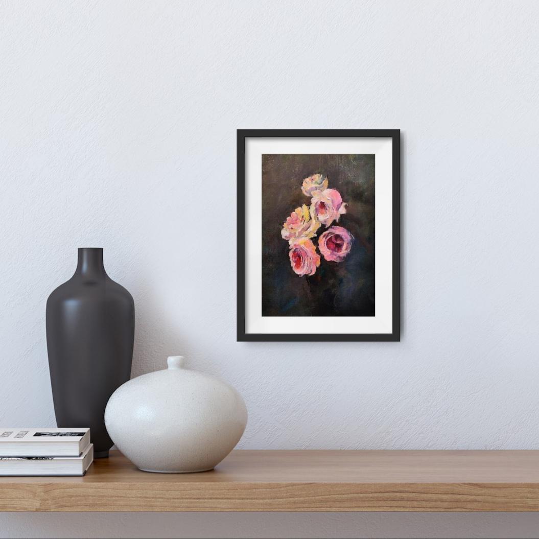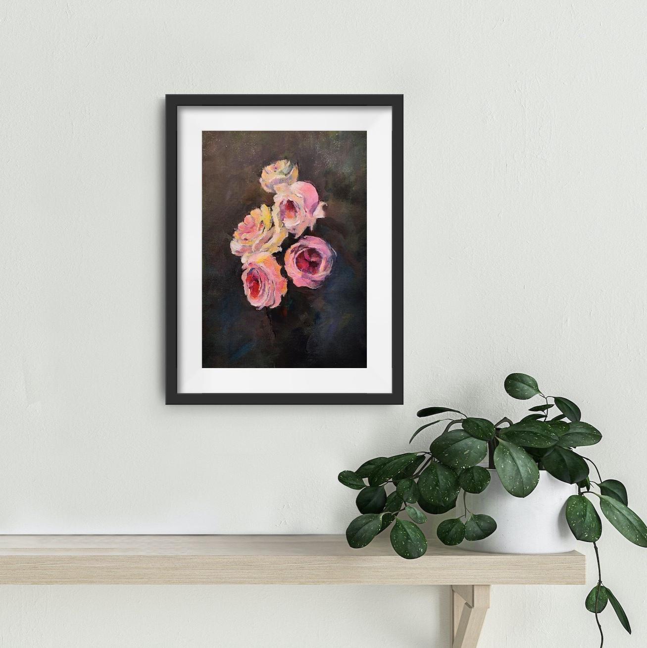 Original Rose acrylic painting. Pink Rose bouquet painting on black. Dark floral painting, a beautiful presentable gift for a collector, gifts for your best friend 8x12 inches, 20x28 cm.